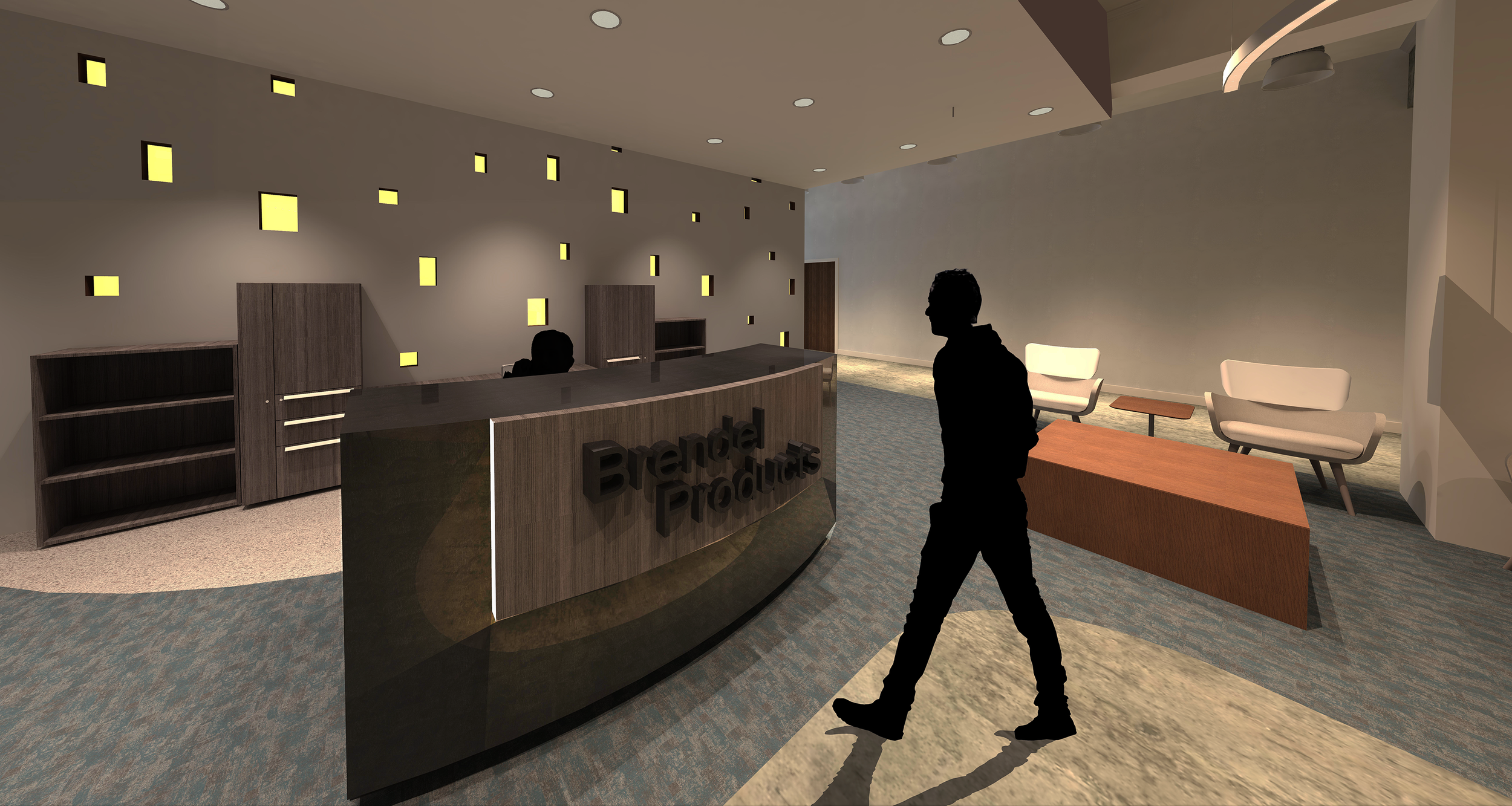The first thing a user will see is Lobby area for the company. It includes a custom-made reception desk made with natural quartz, a drop-down ceiling that creates a more intimate environment, and a custom back lit wall representing the city lights of Chicago. A few other things to notice is the use of a local photographers work of the city, a wallpaper hugging the core wall and main pathway, and the technique of separation of space through flooring.